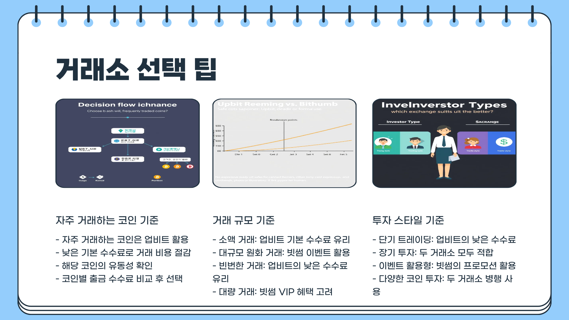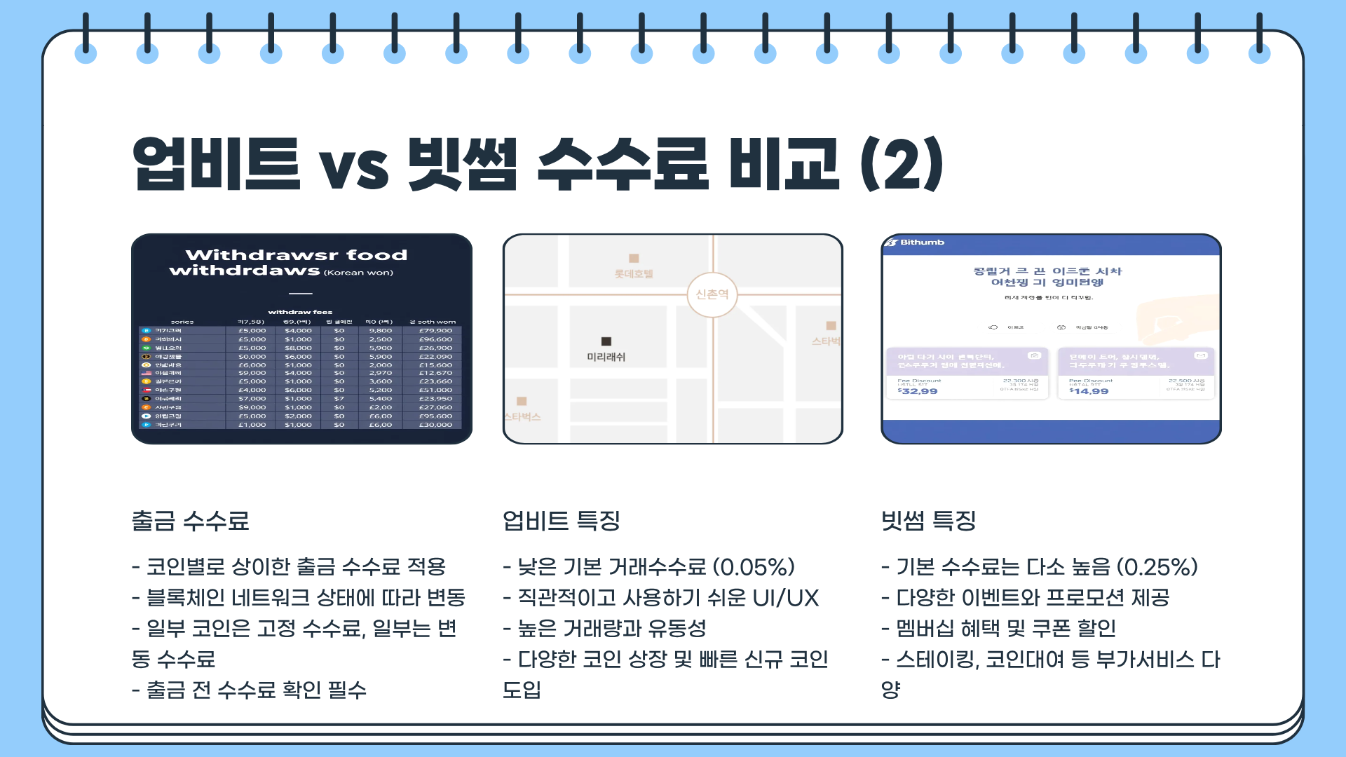 팁: 자주 거래하는 코인은 업비트를, 대규모 원화 거래 시 빗썸 이벤트를 활용하면 비용 절감 가능하다.