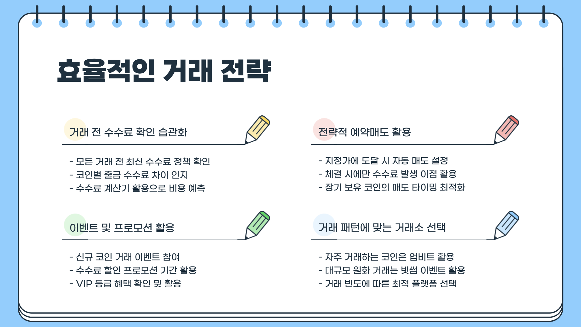 - 수수료 이벤트 활용: 신규 코인 거래 이벤트, 수수료 할인 기간 적극 활용