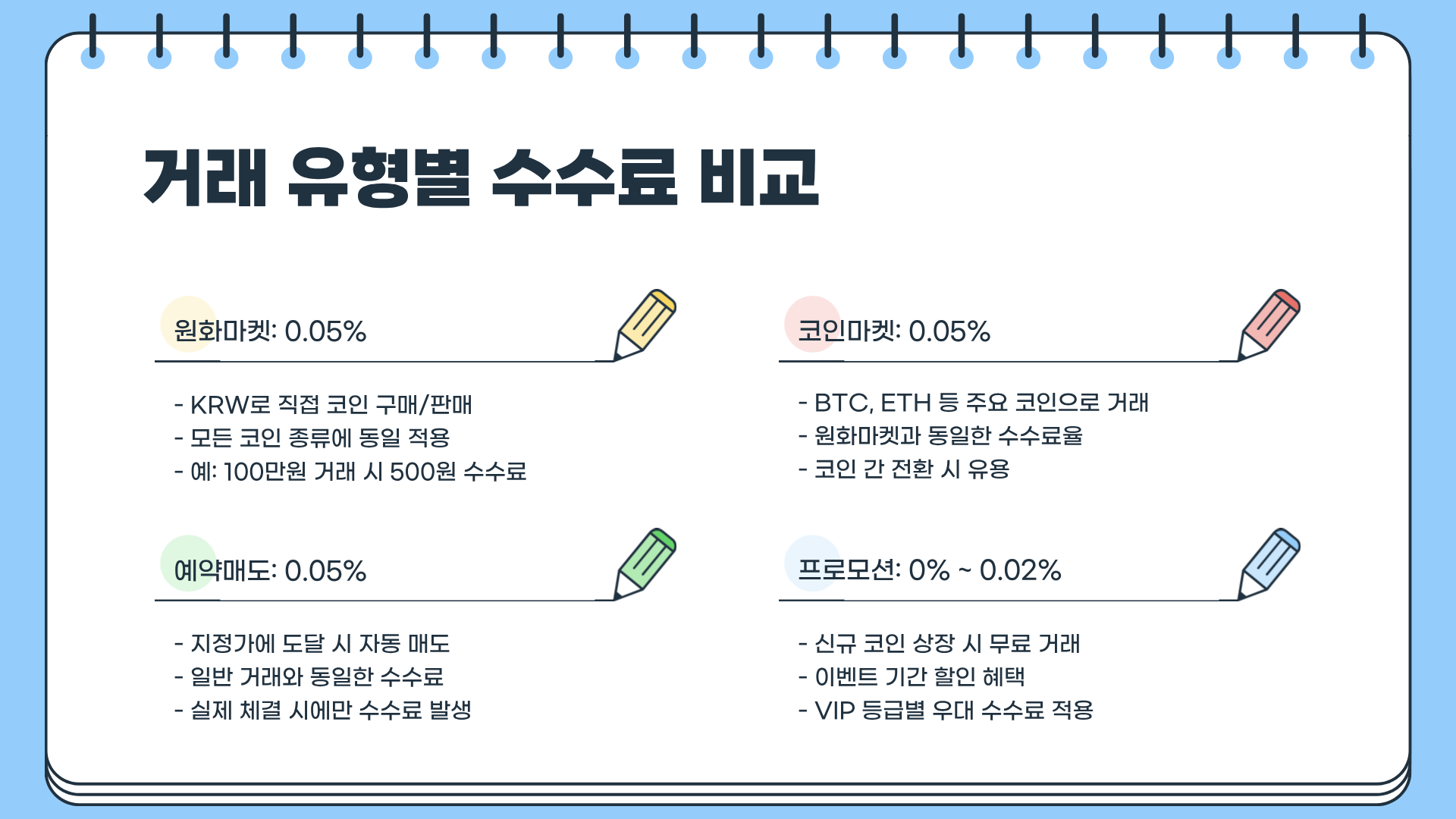 | 업비트 | 0.05% | 0.05% | 코인별 상이 | 낮은 거래수수료, UI 편리 |