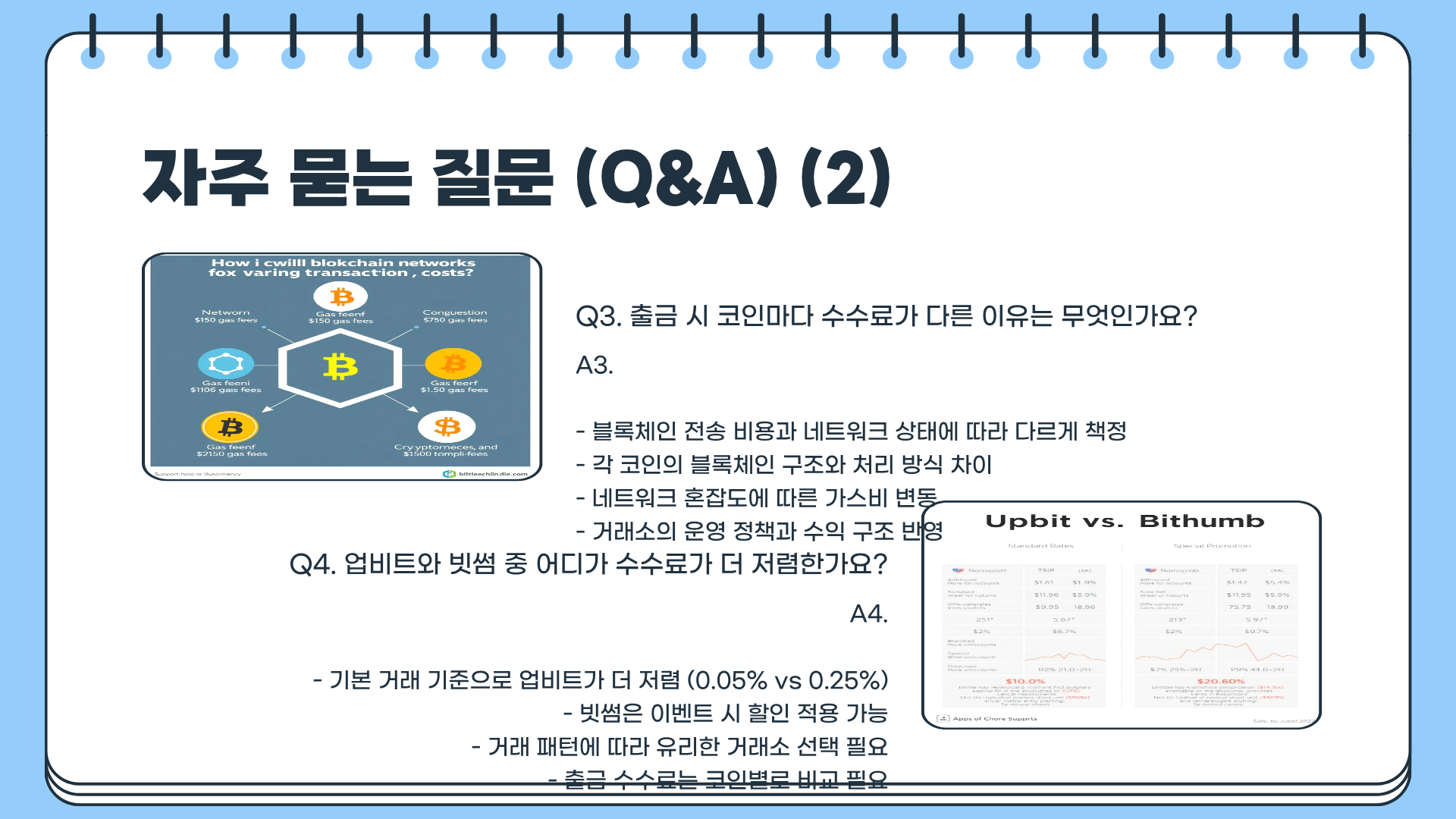 A4. 기본 거래 기준으로 업비트가 더 저렴하며, 빗썸은 이벤트 시 할인 적용 가능하다.
