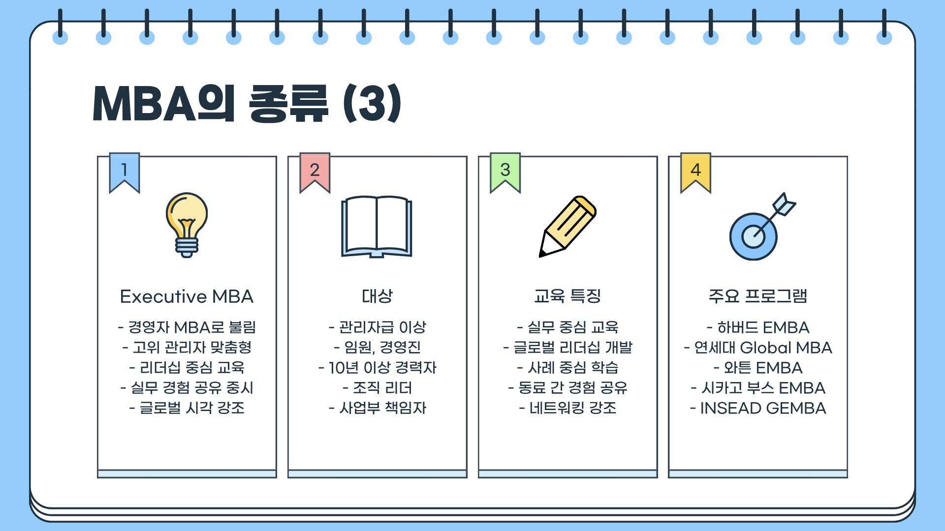 - 대표 대학: 하버드 EMBA, 연세대 Global MBA