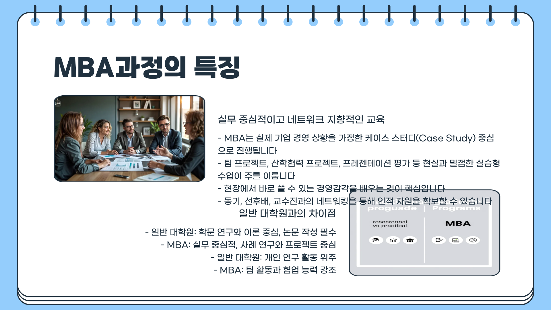 MBA는 일반 대학원보다 훨씬 실무 중심적이며 네트워크 지향적이다.