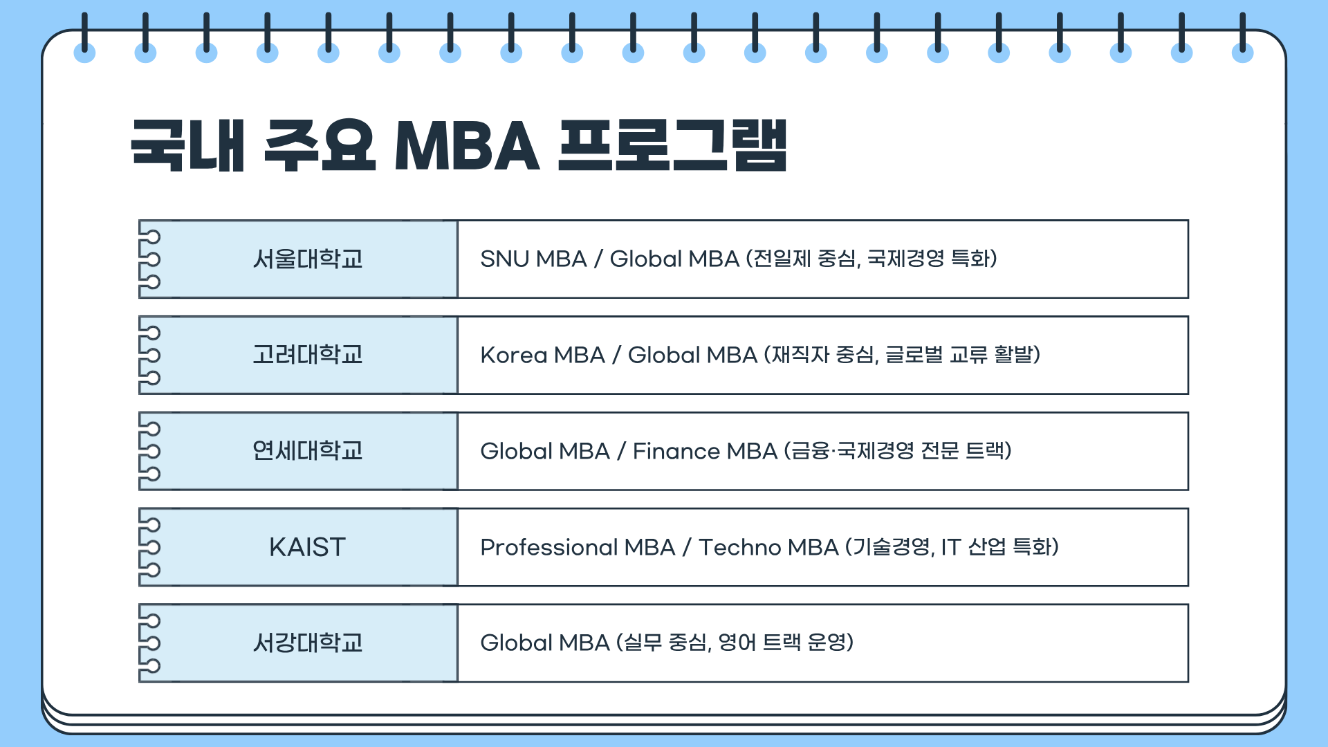 | 서울대학교 | SNU MBA / Global MBA | 전일제 중심, 국제경영 특화 |