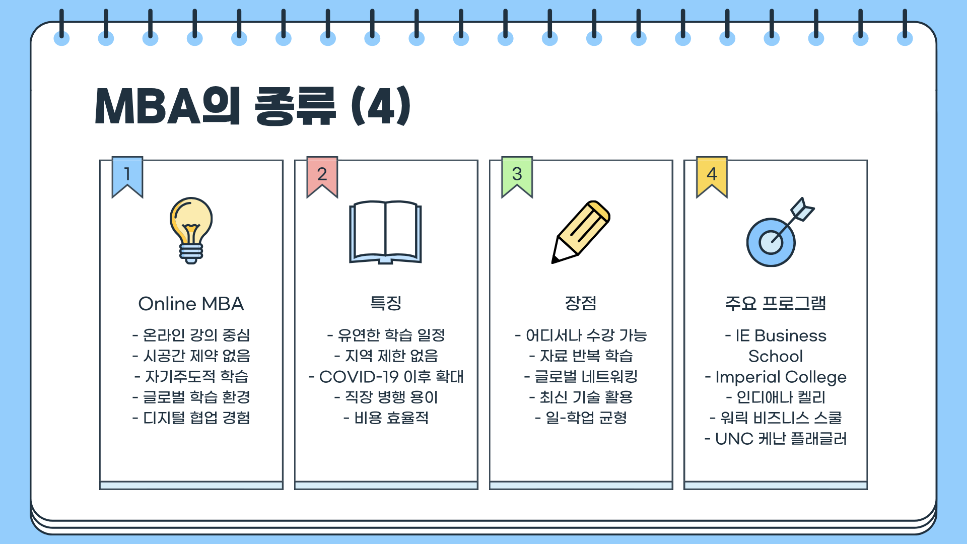 | Online/Global MBA | 해외 학습 희망자 | 1~2년 | 비대면 학습 |
