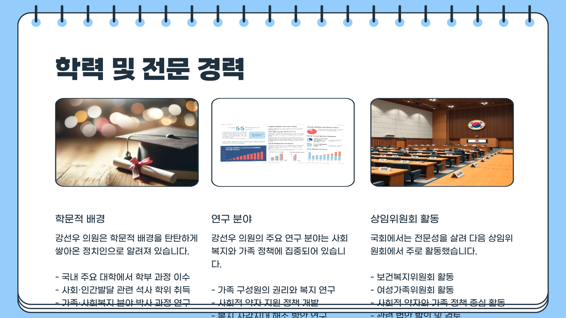- 활동 분야: 복지·가족정책·사회 안전망 강화